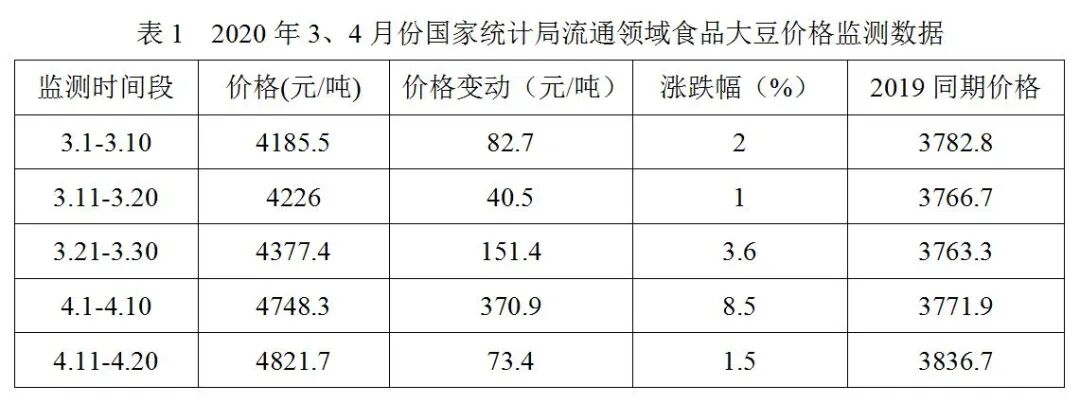 ▲表1 2020年3、4月份国家统计局流通领域食品大豆价格监测数据